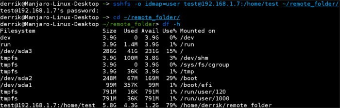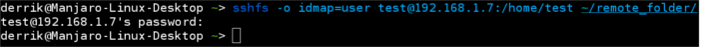 sshfs 挂载文件系统到本地目录1 注意: 也可以通过 SSH 密钥文件挂载 SSHfs 文件系统。只需要在上面的命中用 sshfs -o IdentityFile=~/.ssh/keyfile, 替换 sshfs -o idmap=user 部分。 输入这个命令之后,会提示你输入远程用户的密码。如果登录成功了,你的远程文件系统就会被挂载到之前创建的 ~/remote_folder 目录。
