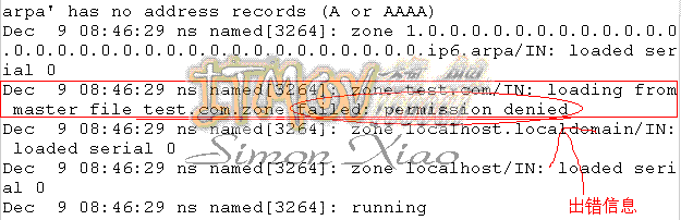对比本地正想区域数据与test.com.zone的权限相同,但归属组不同,问题就在这里,我们使用用户root来管理系统配置,所以创建的文件权限如图示,这样named进程无法读取该文档内数据,方法如下: