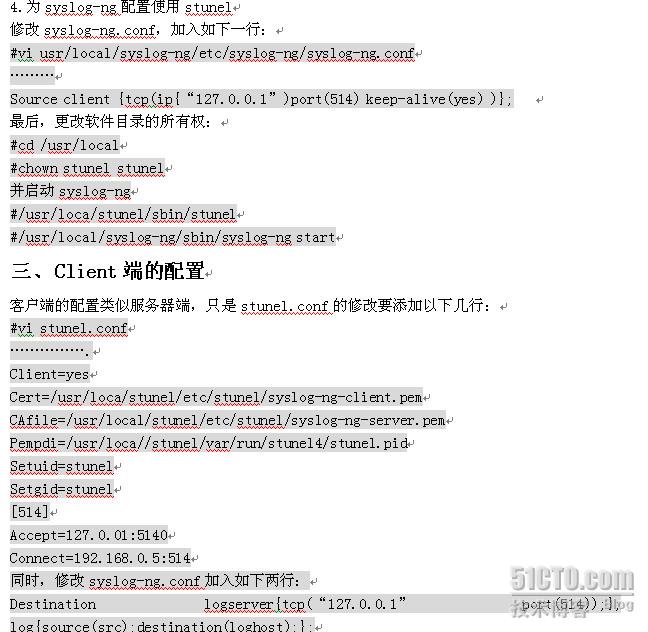 启动syslog-ng程序即可: #/usr/local/stunel/sbin/stunel #/usr/loca/syslog-ng/sbin/syslog-ng start 四、测试 在客户端输入如下代码: #logger “hel..."> 启动syslog-ng程序即可: #/usr/local/stunel/sbin/stunel #/usr/loca/syslog-ng/sbin/syslog-ng start 四、测试 在客户端输入如下代码: #logger “hel..." /> 启动syslog-ng程序即可: #/usr/local/stunel/sbin/stunel #/usr/loca/syslog-ng/sbin/syslog-ng start 四、测试 在客户端输入如下代码: #logger “hel..." />
