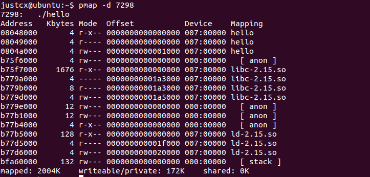从上面可以看出: 1:可执行对象hello的 代码段、数据段 、bss段的虚拟内存区间 2:C库中libc.so的代码段、数据段、bss段 3:动态链接程序ld.so的代码段、数据段、bss段 4:分配的内存段即相当于堆段 [anon] ,分配的栈段 [stack] 5: mappded: 2004K 表示该进程的全部地址空间大约为2004K 6:writeable/private 172k 表示可读写的内存空间大小,即消耗的物理内存空间大小。 进程访问了2003KB的数据和代码空间,而仅仅消耗了172KB的物理内存,如果一片内存区域是共享的或者不可写的,那么内核只需要在内存中为此保留一份映射。可以看出利用这种共享不可写内存的方法节约了大量内存空间。 |