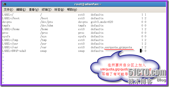 用 vi /etc/fstab 进入编辑此文件,在要限额的分区后面加入usrquota,grpquota,按如图所示操作