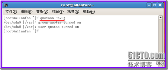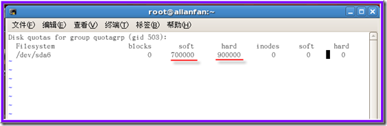 最后再quota命令查看我们的设定状况,OK针对用户的配额设定就大功告成.
