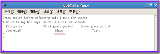 设定宽限日期用 edquota -t,默认是七天,根据情况自己定.