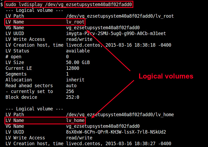 物理卷的名字和卷组的名字分别在PV和VG列的下面。本例中,只有一个创建在dev/sdb2下的组“vg_ezsetupsystem40a8f02fadd0”。 接下来检查卷组中存在的逻辑卷,使用lvdisplay命令:
