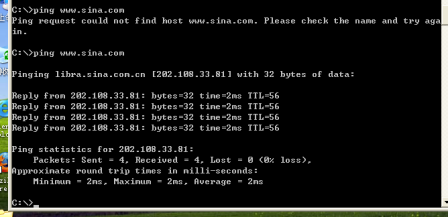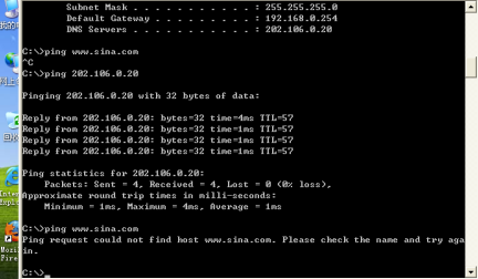 配置完成后测试PING不通外网域名,可以PING通外网IP;