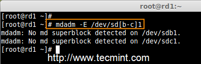 检查 RAID 类型 注意: 正如你在上图所看到的,在 sdb1 和 sdc1 中没有任何对 RAID 的定义,这就是我们没有检测到超级块的原因。 第3步:创建 RAID 1 设备5、 接下来使用以下命令来创建一个名为 /dev/md0 的“RAID 1”设备并验证它