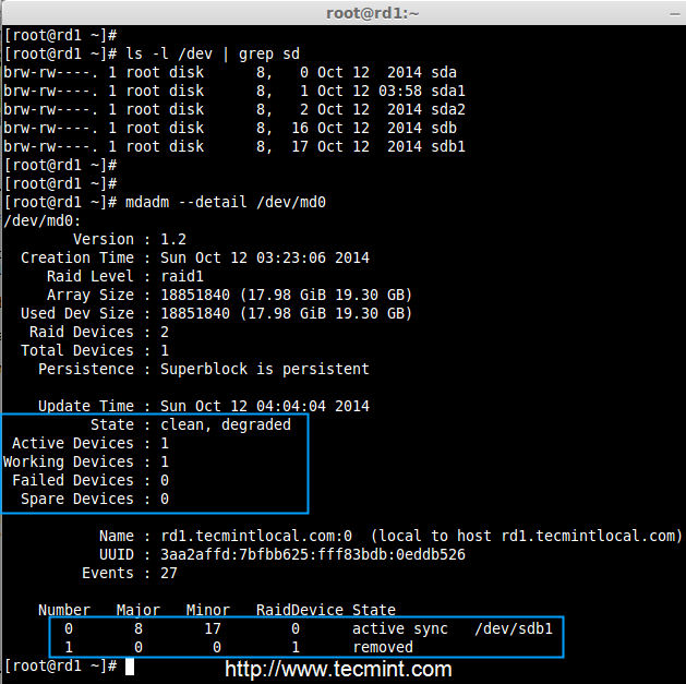 验证 RAID 设备 在上面的图片中,我们可以看到在 RAID 中有2个设备是可用的,并且 Active Devices 是2。现在让我们看看,当一个磁盘拔出(移除 sdc 磁盘)或损坏后会发生什么。