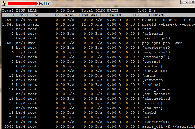 Iotop is a Python program with a top like UI used to show of behalf of which process is the I/O going on. It requires Python ≥ 2.7 and a Linux kernel ≥ 2.6.20 with the TASK_DELAY_ACCT CONFIG_TASKSTATS, TASK_IO_ACCOUNTING and CONFIG_VM_EVENT_COUNTERS options on. iotop安装: