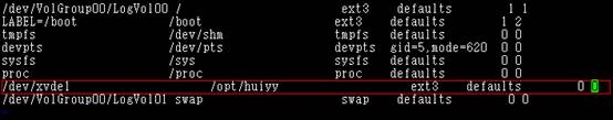 6、 挂载磁盘 a) 创建磁盘挂载目标文件夹 命令mkdir /opt/huiyy b) 挂载磁盘 命令mount /dev/xvde1/opt/huiyy c) 记录到/ext/fstab文件中(防止重启后挂载丢失) 命令vi /etc/fstab