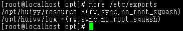 7、 配置共享 共享目录“/opt/huiyy/resource”和“/opt/huiyy/log”权限“rw,sync,no_root_squash” 命令vi /etc/exports编辑内容后:wq保存退出
