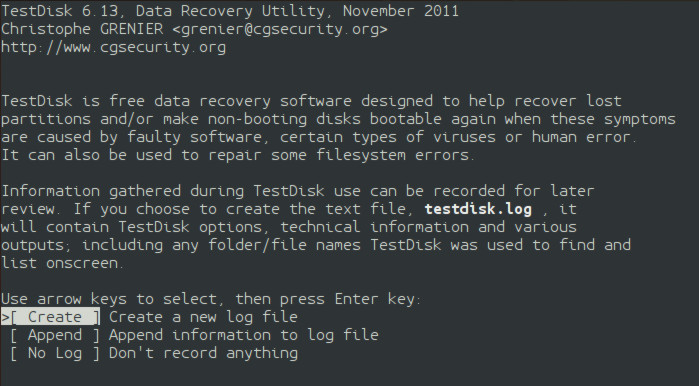 恢复软件是如何工作的?大多数的文件系统(在删除文件时)只是标记空间为空白。在这些文件系统下,恢复软件查看文件分配表这个文件,然后复制被删除的文件到另外的存储单元中。假如该文件被复制到其它需要恢复的被删除的存储单元中,那么用户将有可能会失去那个所需的删除文件。 文件系统很少会擦除文件分配表中的条目。假如文件系统真的这样做了, 这便是恢复软件在恢复文件了。恢复软件在存储单元中扫描文件头,所有文件都拥有一个特殊的编码字符串,它们位于文件的最前面,也被叫做 魔法数字。例如,一个编译的 JAVA 类文件的魔法数字在十六进制中是“CAFEBABE”。所以,假如要恢复该类型的文件,恢复软件会查找 “CAFEBABE” 然后复制文件到另一个存储单元。一些恢复软件可以查找某种特殊的文件类型。若用户想恢复一个 PDF 文件,则恢复软件将会查找十六进制的魔法数字 “25504446”,这恰恰是 ASCII 编码中的 “%PDF”。恢复软件将会查找所有的魔法数字,然后用户可以选择恢复哪个已删除的文件。 假如一个文件的部分被覆写了,则整个文件就会被损坏。通常这个文件可以被恢复,但是其中的内容可能已经没有什么用处。例如,恢复一个已损坏的 JPEG 文件将会是无意义的,因为图片查看器不能从这个损坏的文件产生一幅图片。因此,即使用户拥有了这个文件,该文件也将毫无用处。 设备的位置:在我们继续之前,下面的一些信息将会对指引恢复软件找到正确的存储单元起到一定的帮助。所有的设备均挂载在 /dev/ 目录下。操作系统赋予每个设备的名称(并不是管理员给予每个分区或设备的名称)遵循一定的命名规律。 第一个 SATA 硬盘的第二个分区的名称将会是 sda2。名称的第一个字母暗示了存储类型,在这里指的是 SATA,但字母 “s” 也可能指的是 SCSI、 FireWire(火线端口)或 USB。第二个字母 “d” 指的是 disk(硬盘)。第三个字母指的是设备序数,即字母 “a” 指的是第一个 SATA 而 “b” 指的是第二个。最后的数字代表分区。没有分区数字的设备名代表该设置的所有分区。对于上面的例子,对应的名称为 sda 。作为命名的第一个字母还可能是 “h” ,这对应 PATA 硬盘(IDE)。 以下为命名规律的一些例子。假如一个用户有一个 SATA 硬盘(sda),这个设备有 4 个分区- sda1、 sda2、 sda3 和 sda4 。该用户删除了第三个分区,但直到格式化第四个分区之前,第四个分区名 sda4 都将保留不变。然后该用户插入了一个带有一个分区 - 即sdb1- 的 usb 存储卡(sdb),又增加了一个带有一个分区 -hda1- 的 IDE 硬盘 ,接着该用户又增加了一个 SCSI 硬盘 - sdc1 。接着用户移除了 USB 存储卡(sdb)。现在,SCSI 硬盘的名称仍然为 sdc,但如果这个 SCSI 被移除接着再被插入,则它的名称将变为 sdb。虽然还有其他的存储设备存在, 那个 IDE 硬盘的名称仍会有一个 “a”, 因为它是第一个 IDE 硬盘,IDE 设备的命名与 SCSI、 SATA、 FireWire 和 USB 设备要分开计数。 使用 TestDisk 进行恢复:每个恢复软件有其不同的功能,特征及支持的不同文件系统。下面是一些关于 使用 TestDisk 在各种文件系统中恢复文件的指南。 FAT16、 FAT32、 exFAT (FAT64)、 NTFS 以及 ext2/3/4:TestDisk 是一个运行在 Linux、 *BSD、 SunOS、 Mac OS X、 DOS 和 Windows 等操作系统下的开源的自由软件。 TestDisk 可以从下面的链接中找到 :http://www.cgsecurity.org/wiki/TestDisk。TestDisk 也可以通过键入 sudo apt-get install testdisk 来安装。TestDisk 有着许多的功能,但这篇文章将只关注恢复文件这个功能。 使用 root 权限从终端中打开 TestDisk 可以通过键入 sudo testdisk 命令。 现在, TestDisk 命令行应用将会被执行。终端的显示将会改变。TestDisk 询问用户它是否可以保留日志,这完全由用户决定。假如一个用户正从系统存储中恢复文件,则不必保留日志。可选择的选项有“生成”、 “追加” 和 “无日志”。假如用户想保留日志,则日志将会保留在该用户的主目录。