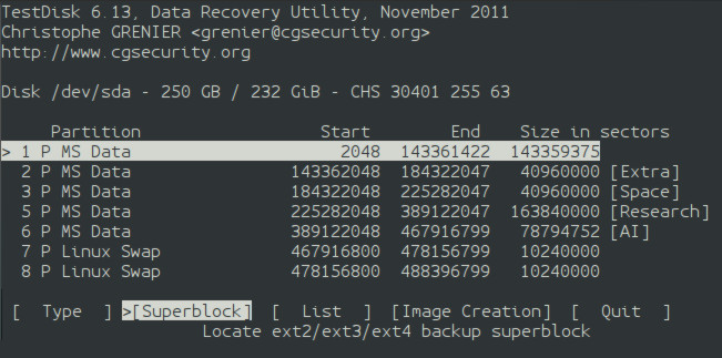 下一屏显示出一个列有分区表(也叫做分区映射表)的清单。正如文件有文件配置表,分区有着分区表。分区是存储设备上的分段。例如在几乎所有的 Linux 系统中,至少存在两种分区类型 - EXT3/4 和 Swap 。每一个分区表将会在下面被简要地描述。TestDisk 并不支持所有类型的分区表,所以这并不是完整的列表。