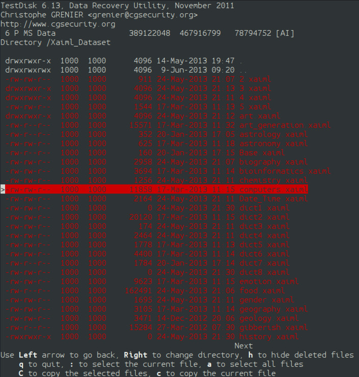 举个例子,我想进入"Xaiml_Dataset" 目录,该目录基本上由被删除的文件组成。通过按键盘上的 "c"键,我将恢复文件 "computers.xaiml",接着我被询问选择一个目标目录,当然,我应该放置该文件到另一个分区中。现在,当我在我的家目录时,按下了“c”键。(选择目标目录时)哪个目录被高亮并没有什么影响,当前目录就是目标目录,在屏幕的上方,将会显示“复制完成”的消息。在我的家目录中便会有一个名为"Xaiml_Dataset"的目录,里面里有一个 Xaiml 文件。 假如我在更多的已删除文件上按“c” 键,则这些文件将会被放置到新的文件夹中而无需再向我询问目标目录。