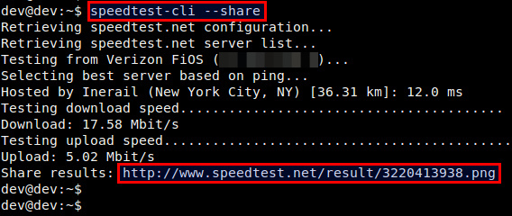 如果你愿意分享测试结果,你可以使用参数“–share”。它将会把你的测试结果上传到Speedtest.net服务器并以图形的方式分享给其他人。