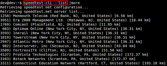 如果你对目前所有可用的Speedtest.net服务器感兴趣,你可以使用参数“–list”。它会打印出所有的Speedtest.net服务器(按照离你的地理距离由近及远排序)。