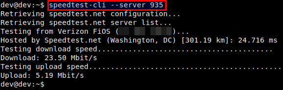 在上面的列表中,每个服务器的前面都有一个与其对应的ID。如果想使用指定的服务器来测试你的网速,你只需要在speedtest-cli命令后指定其ID即可。例如,如果想使用在Washington DC的服务器,你只需要指定相对应的服务器ID(如935)。