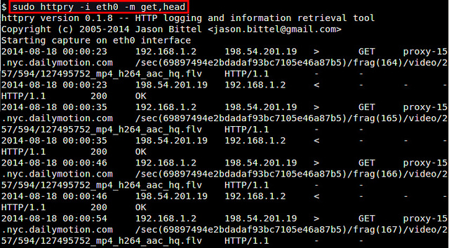 httpry就会监听指定的网络接口,并且实时的显示捕获到的HTTP请求/相应。
