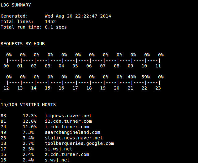 你可能在使用插件的时候遇到警告。比如,如果你没有安装带有DBI接口的MySQL数据库,那么使用db_dump插件时可能会失败。如果一个插件初始化失败的话,那么只是这个插件不能使用,所以你可以忽略那些警告。 当parse_log.pl完成后,你将在httpry/scripts 目录下看到数个分析结果。例如,log_summary.txt 与如下内容类似。