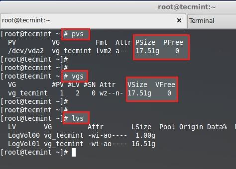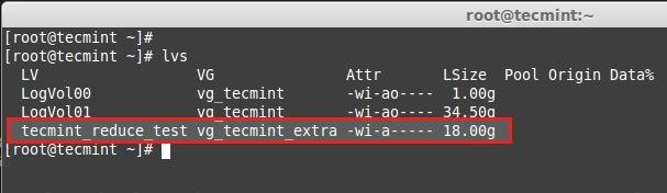 检查可用的物理扩展 总共有4607空闲PE可用,亦即有18GB空间空间可用。因此,我们可以将我们的逻辑卷扩展到18GB这么大。让我们使用PE大小来扩展。