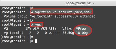创建物理卷 扩展卷组添加该pv到vg_tecmint卷组来扩展卷组的大小,以获取更多空间来扩展lv。