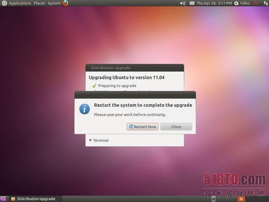 图 11 确认重启系统 当你登录时,Ubuntu 11.04将使用默认的Unity桌面,需要你的硬件支持3D加速,如果不支持,可以在登录屏幕选择“Ubuntu经典桌面”: