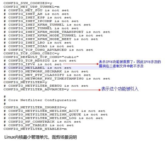 如果该功能模块被裁剪了,即使该漏洞没有被补丁修复,那么该功能模块中存在的漏洞在二进制中也是不受影响的,因此和IPV6相关的漏洞在漏洞检测时就应该在报告中明显的标识出不受该漏洞的影响,如CVE-2013-0343(Linux kernel 3.8之前版本内的net/ipv6/addrconf.c中的函数 ipv6_create_tempaddr没有正确处理IPv6临时地址生成问题,可允许远程攻击者通过 ICMPv6 Router Advertisement (RA) 消息,造成拒绝服务,然后获取敏感信息。)。