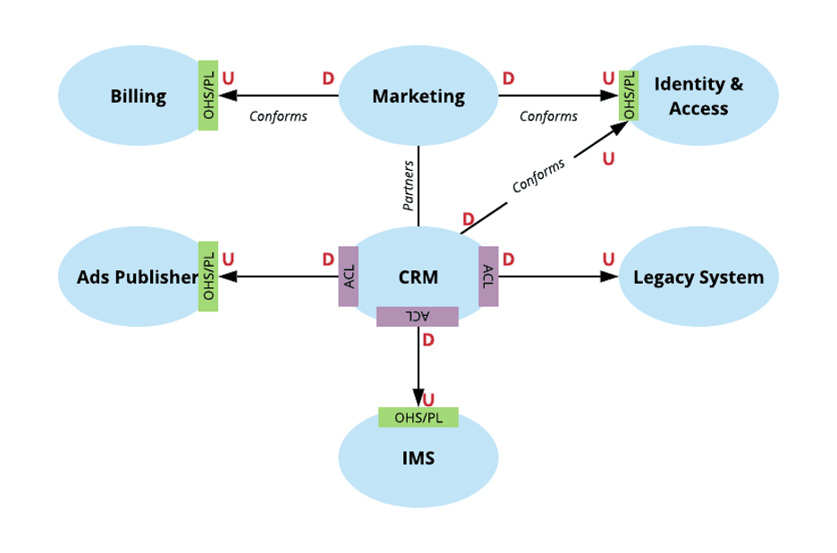 关于服务的上下游的定义,在DDD建模方法中,在确定了限界上下文(bounded context)后通过在上下文映射(context mapping)中使用上下游来表示上下文依赖的方向,其确定的依据是下游需要了解上游的领域知识实现业务,反之则不会。引申的含义就是上游的业务能力可以不用关心下游业务的存在,下游业务的开展依赖于上游提供的业务能力。下图是限界上下文映射的一个例子: