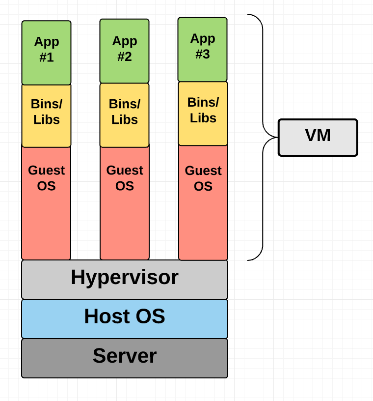 如大家所见,虚拟机会将虚拟硬件、内核(即操作系统)以及用户空间打包在新虚拟机当中。