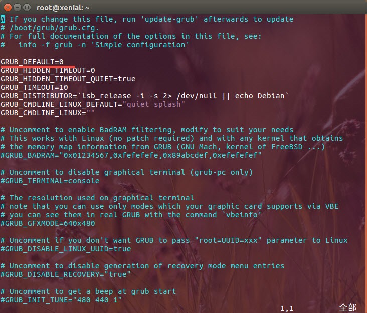 为加快开机引导过程,用户可以手动指定默认要从哪个系统开始引导。如果设置为 0 则表示从 GRUB 选单中的第一个系统开始引导,如果设置为 1 则表示从第二个条目开始引导,以此类推。