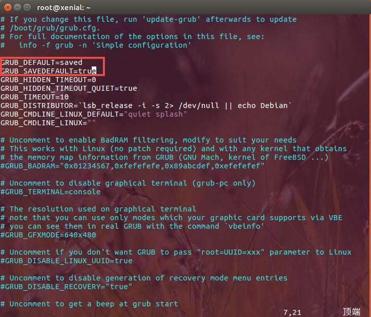 如果你装了多个操作系统,可以使用 GRUB_DEFAULT=saved 参数从最后一个系统开始引导,配置好后你每次重启计算机都会直接从最后一个系统开始启动。注意:此功能还需配合一个 GRUB_SAVEDEFAULT=true 条目才能生效。