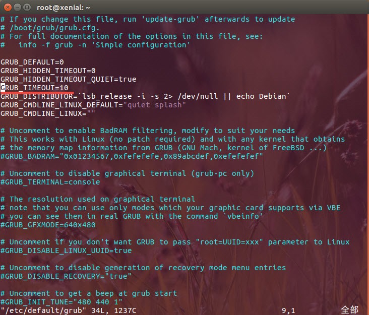 默认情况下,启动菜单停留让用户选择的时间为 10 秒。用户可以直接在配置文件中增长或缩短等待时间,如果将GRUB_TIMEOUT 设置为 0,则表示忽略选单直接按上步中选择的默认操作系统进行引导。