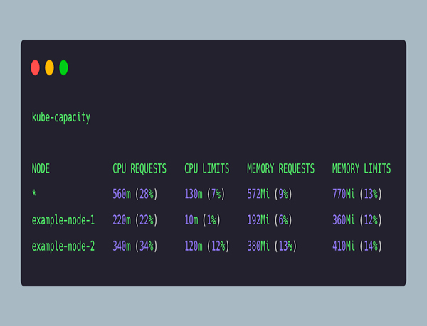 默认情况下,kube-capacity 将输出一个节点列表,其中包含 CPU 和内存资源请求的总数以及在它们上运行的所有 pod 的限制。对于具有多个节点的集群,第一行还将包括集群范围的总数。该输出将如下所示: