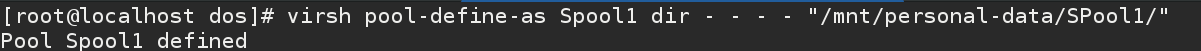 # virsh pool-define-as Spool1 dir - - - - "/mnt/personal-data/SPool1/"