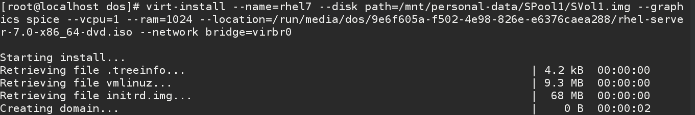 virt-install --name=rhel7 --disk path=/mnt/personal-data/SPool1/SVol1.img --graphics spice --vcpu=1 --ram=1024 --location=/run/media/dos/9e6f605a-f502-4e98-826e-e6376caea288/rhel-server-7.0-x86_64-dvd.iso --network bridge=virbr0