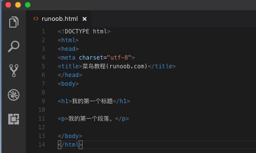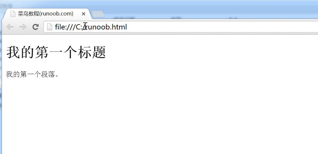 <!DOCTYPE html> <html> <head> <meta charset="utf-8"> <title>菜鸟教程(runoob.com)</title> </head> <body> <h1>我的第一个标题</h1> <p>我的第一个段落。</p> </body> </html>