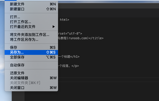 然后选择" 文件(F)->另存为(A) ",文件名为 runoob.html: