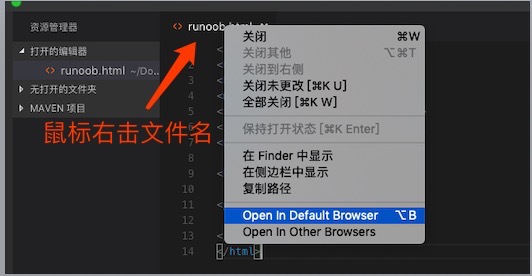 然后鼠标右击编辑器上的文件名,选择在默认浏览器打开(也可以其他的浏览器):