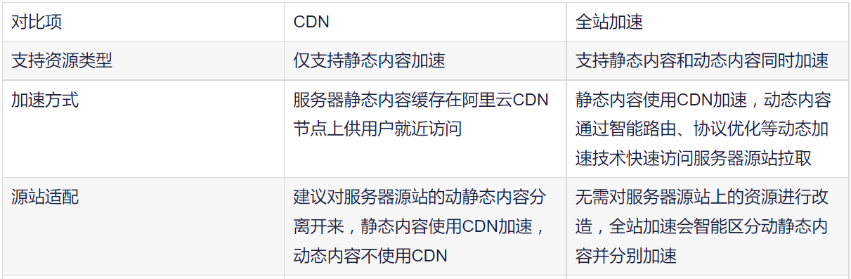 全站加速(DCDN)是在CDN加速的基础上技术升级的云产品。智能区分访问的动态内容还是静态内容。如果是静态内容就直接用阿里云CDN加速,动态内容通过路由决策优化、协议优化等快速回源拉取内容数据。和普通CDN加速只给静态内容加速,比如图片、文档相比,阿里云全站加速(DCDN)可以智能的对动态、静态内容都进行加速。请看表格的功能对比。