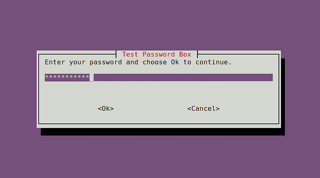 whiptail --title "<password box title>" --passwordbox "<text to show>" <height> <width>