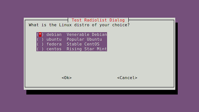 ?whiptail --title "<radiolist title>" --radiolist "<text to show>" <height> <width> <list height> [ <tag> <item> <status> ] . . .