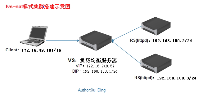 本次构建的lvs-nat模型的示意图如下,其中所有的服务器和测试客户端均使用VMware虚拟机模拟,所使用的CentOS 7