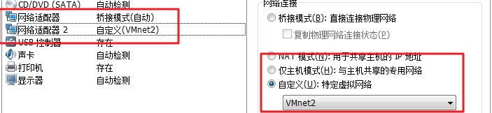 在"虚拟机设置"中增加一个网络适配器设备,并将其自定义特定网络为VMnet2模式,此处为了模拟负载均衡服务器的两张网卡处于不同网段
