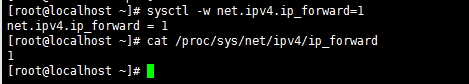 [root@localhost ~]# sysctl -w net.ipv4.ip_forward=1 [root@localhost~]# cat /proc/sys/net/ipv4/ip_forward