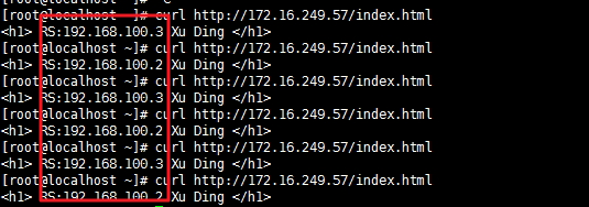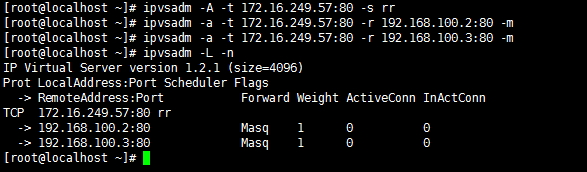 [root@localhost~]# ipvsadm -A -t 172.16.249.57:80 -s rr [root@localhost~]# ipvsadm -a -t 172.16.249.57:80 -r 192.168.100.2:80 -m [root@localhost~]# ipvsadm -a -t 172.16.249.57:80 -r 192.168.100.3:80 -m [root@localhost~]# ipvsadm -L -n