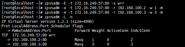 [root@localhost~]# ipvsadm -E -t 172.16.249.57:80 -s wrr [root@localhost~]# ipvsadm -e -t 172.16.249.57:80 -r 192.168.100.2 -w 1 -m [root@localhost~]# ipvsadm -e -t 172.16.249.57:80 -r 192.168.100.3 -w 1 -m [root@localhost~]# ipvsadm -L -n