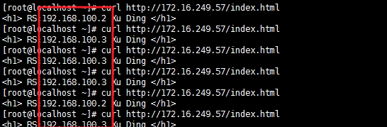 在客户端主机上使用curl命令对VIP发起请求,负载均衡服务器会将请求按照rr算法依次将请求调度给不同的主机进行处理,依次请求给分发给192.168.100.2和192.168.100.3主机响应。
