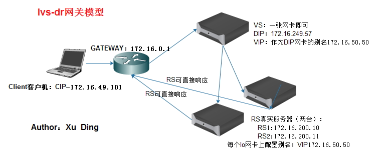 此处的VIP均已别名的形式配置在往卡上,VS是配置在对外通信的DIP的网卡上;RS配置在lo本地回环网卡