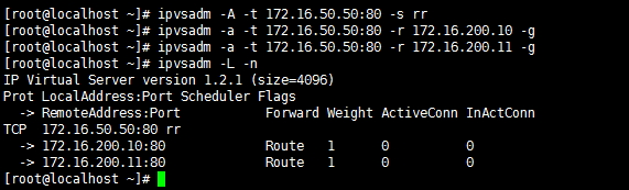[root@localhost~]# ipvsadm -A -t 172.16.50.50:80 -s rr [root@localhost~]# ipvsadm -a -t 172.16.50.50:80 -r 172.16.200.10 -g [root@localhost~]# ipvsadm -a -t 172.16.50.50:80 -r 172.16.200.11 -g [root@localhost~]# ipvsadm -L -n