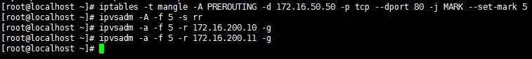 [root@localhost~]# iptables -t mangle -A PREROUTING -d 172.16.50.50 -p tcp --dport 80 -j MARK--set-mark 5 [root@localhost~]# ipvsadm -A -f 5 -s rr [root@localhost~]# ipvsadm -a -f 5 -r 172.16.200.10 -g [root@localhost~]# ipvsadm -a -f 5 -r 172.16.200.11 -g