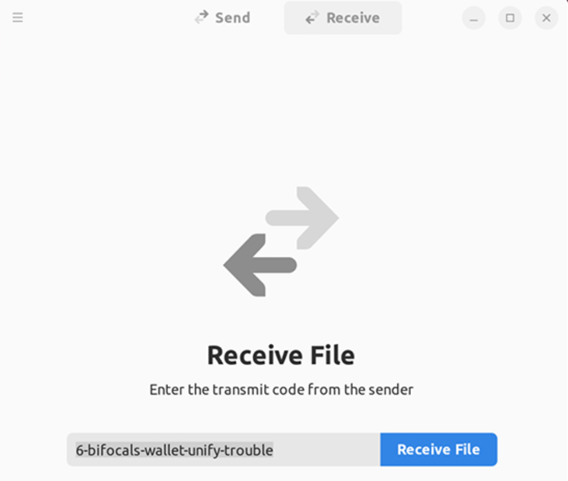 该应用程序提供了一个**式的简单界面,只有两个标签:发送 Send 和接收 Receive。只需点击“发送文件send file”(或文件夹)按钮,并选择您的数据,它将生成一个传输代码。